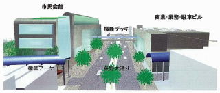 端的に言うと、大型店の動向、つまり東急百貨店とイトーヨーカドーの問題となる。駅前地区の東急百貨店(東急電鉄の自社ビル)は建物の耐震診断を実施したものの、耐震対策をどのように行うのか、さらに今後、店舗をどのように展開するのかが未定であり、合併特例債の活用時限(タイムリミットは今年の8月)を考えると対応が困難であることが最大のネックになっているようだ。一方、権堂地区のイトーヨーカドーは長野電鉄の土地・建物を賃貸して営業を行っている商業施設で、再開発計画では現在のイトーヨーカドーの大通りをはさんだ東側に商業施設を移転させる計画となっている。問題はイトーヨーカドーに一旦は休業・閉店状態となることを見据えつつ営業継続の意思があるか否かである。イトーヨーカドーが撤退となれば、権堂地区の再開発事業は成り立たないこととなる。権堂地区での市民会館建設は、再開発事業組合が8月までに設立されることが大前提となる。【写真は権堂地区での予想図】